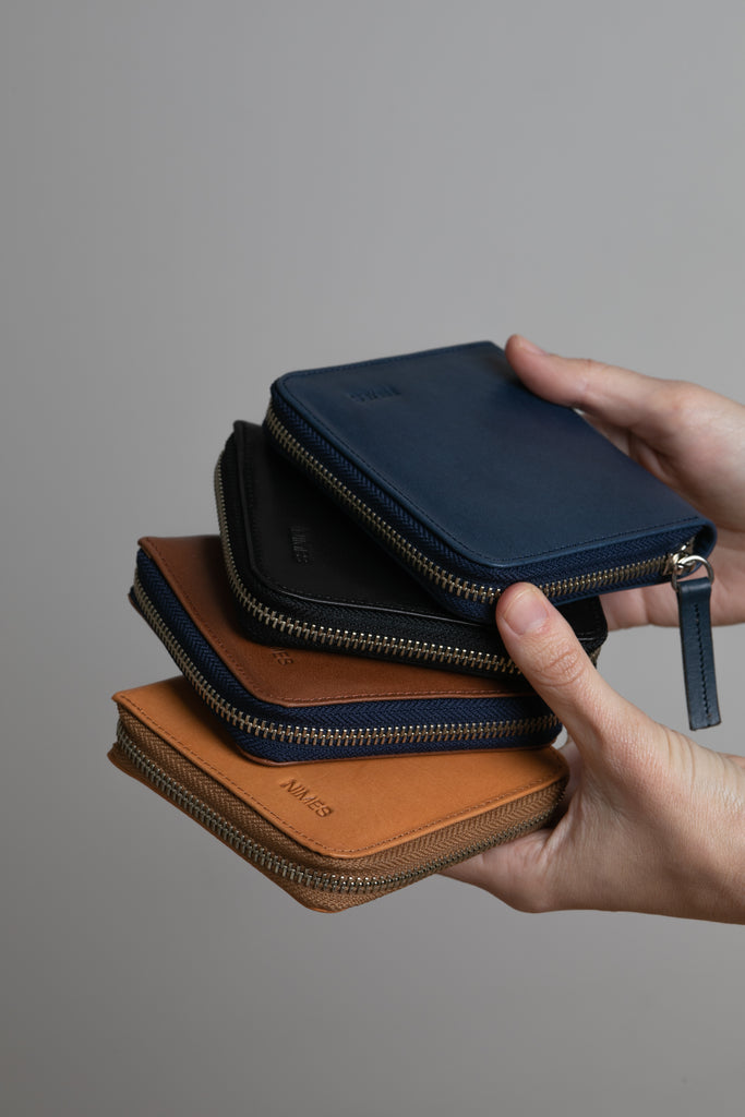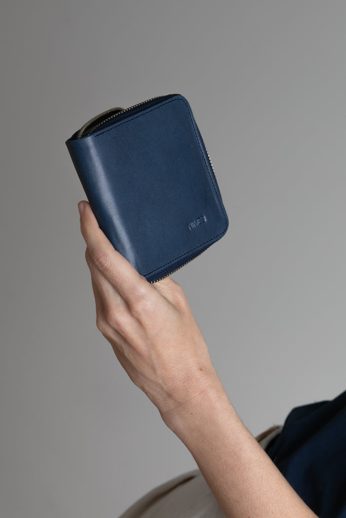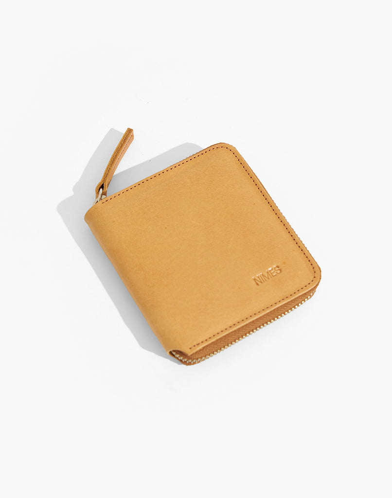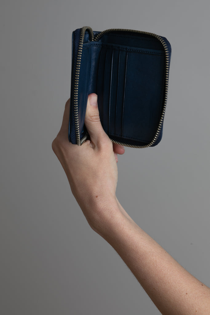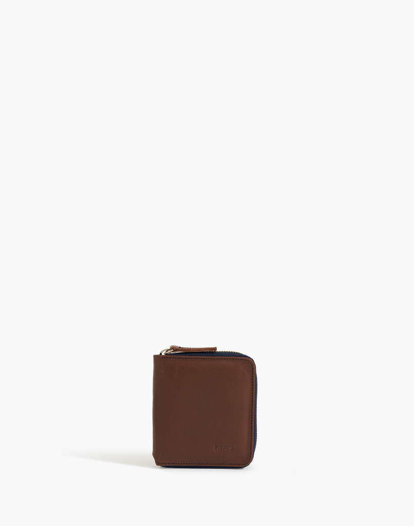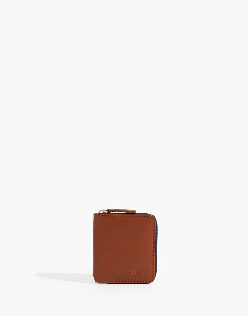 Billetera cuadrada con capacidad para 10 tarjetas y un compartimento para billetes. Confeccionada en cuero liso curtido vegetal y en su interior está forrada con poplin de algodón estampado.