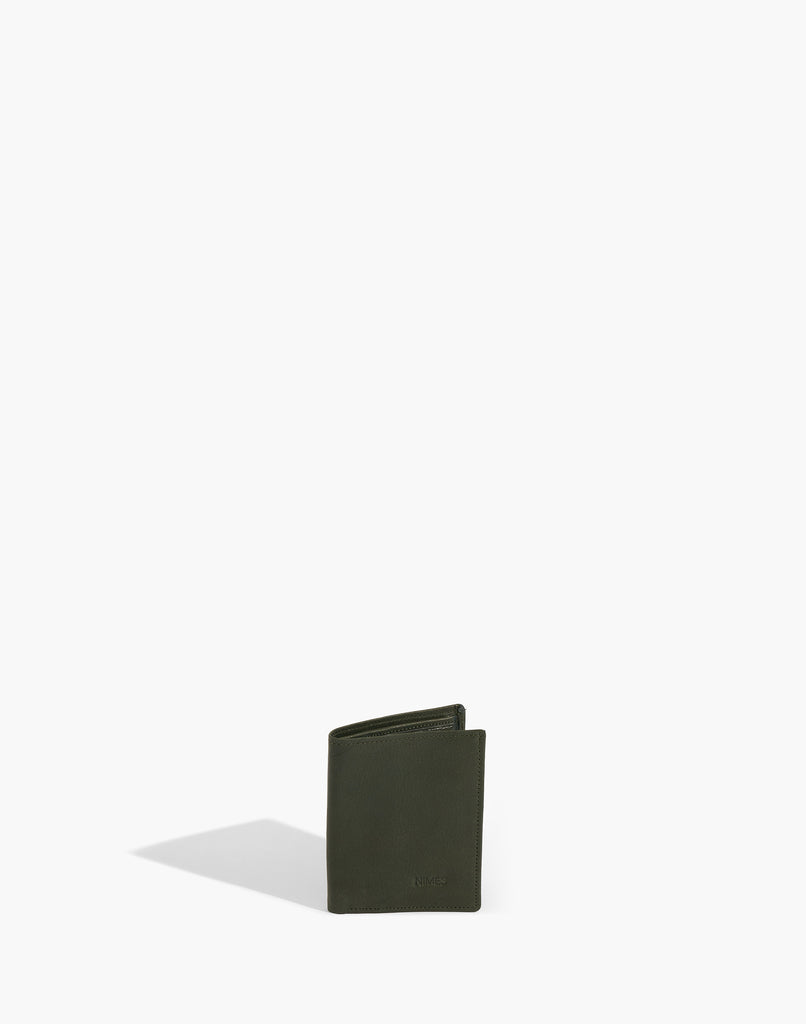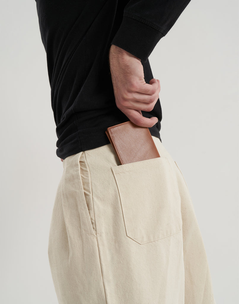 Billetera con capacidad para seis tarjetas y un bolsillo para billetes, confeccionada en cuero liso curtido vegetal. En su interior está forrada con poplin de algodón estampado.