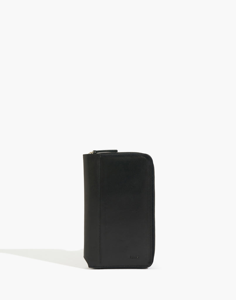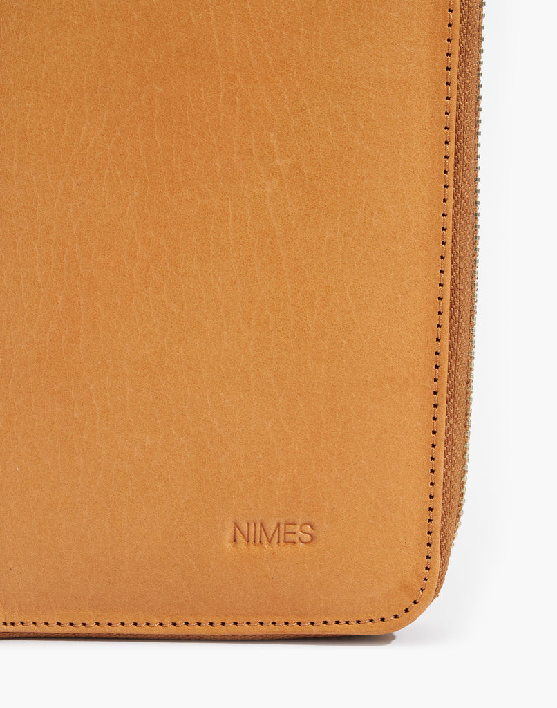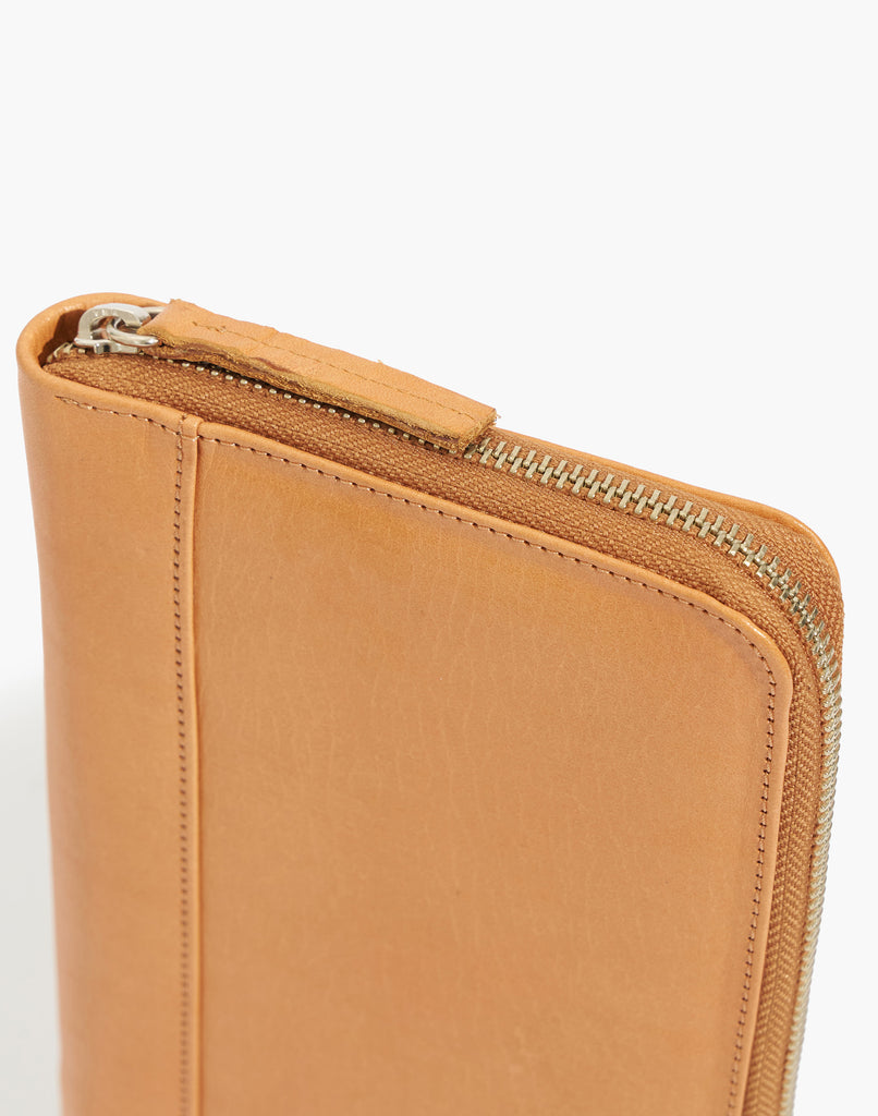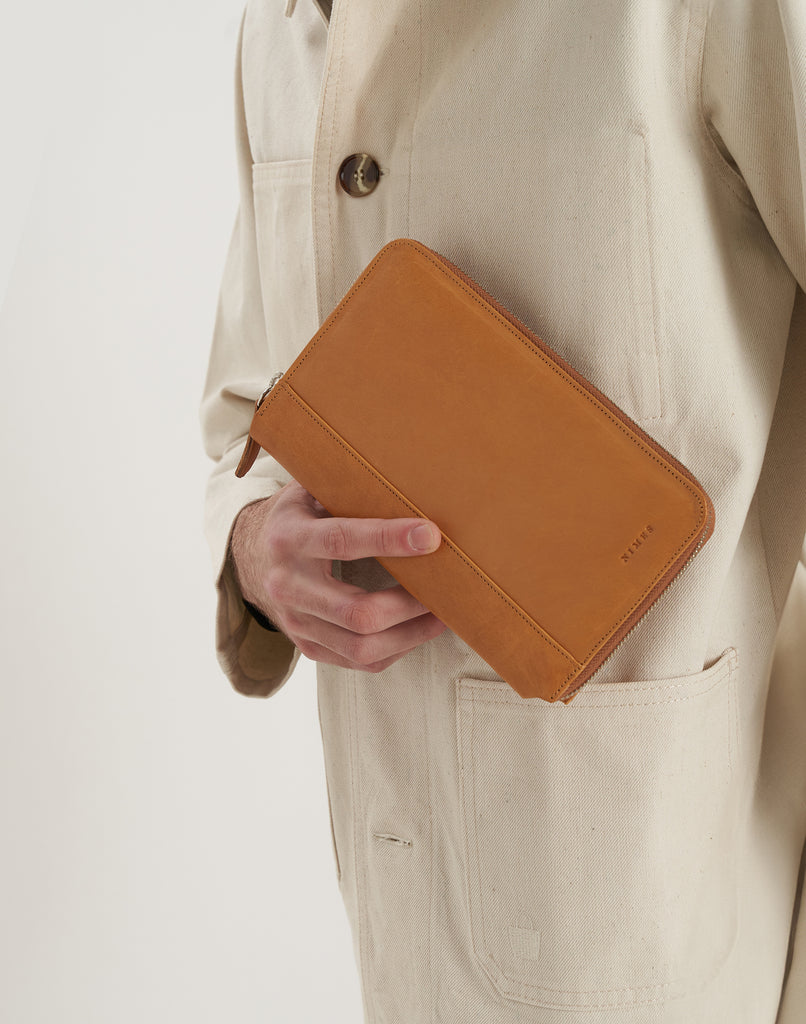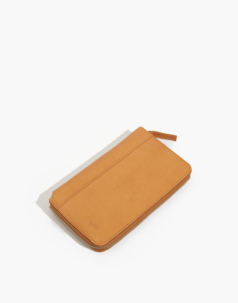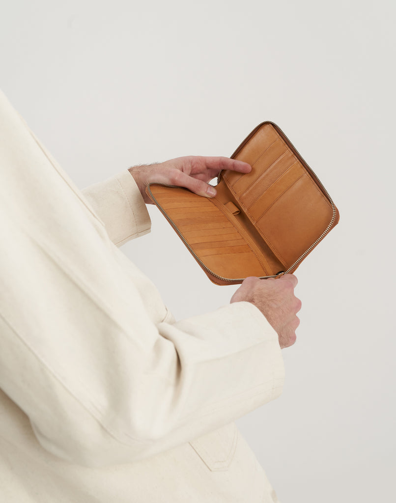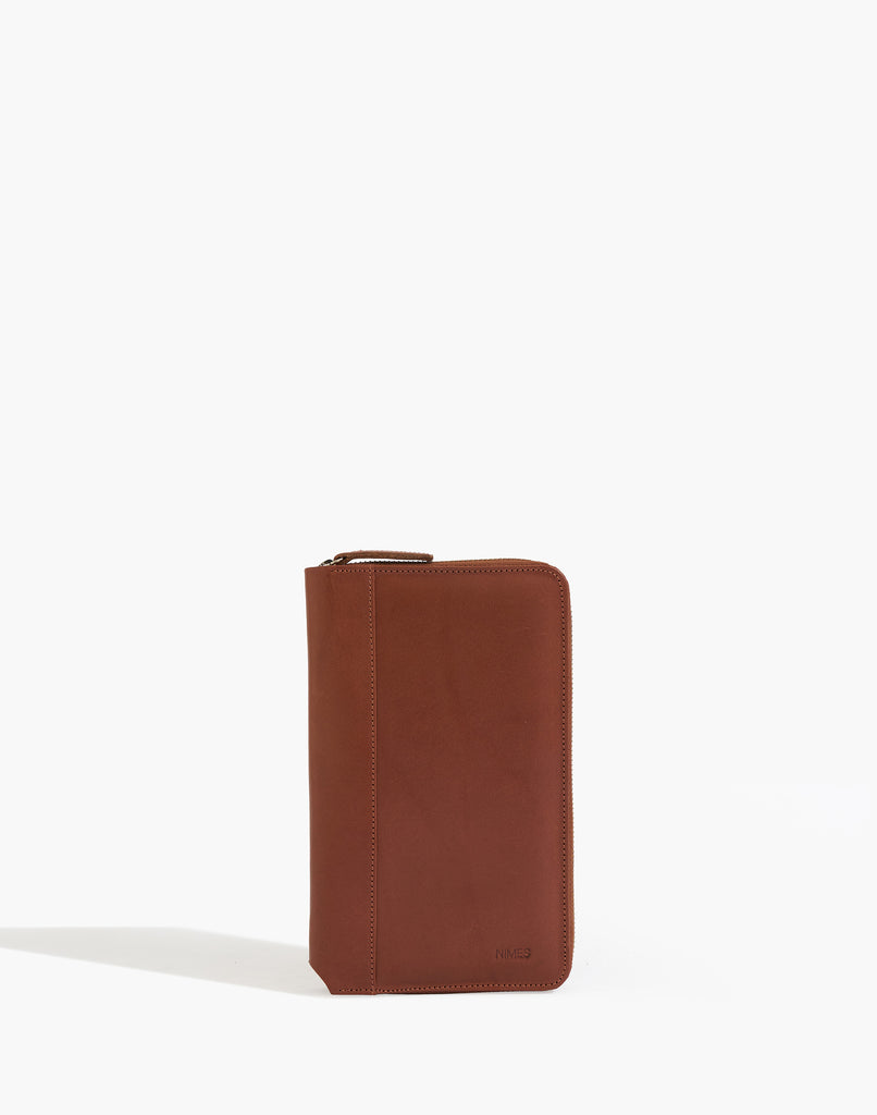 Portadocumentos ideal para llevar de viaje gracias a sus doce compartimentos para tarjetas, cuatro compartimentos para pasaportes y dos bolsillos internos. Está confeccionado en cuero liso curtido vegetal, y en su interior está forrado con poplin de algodón estampado.