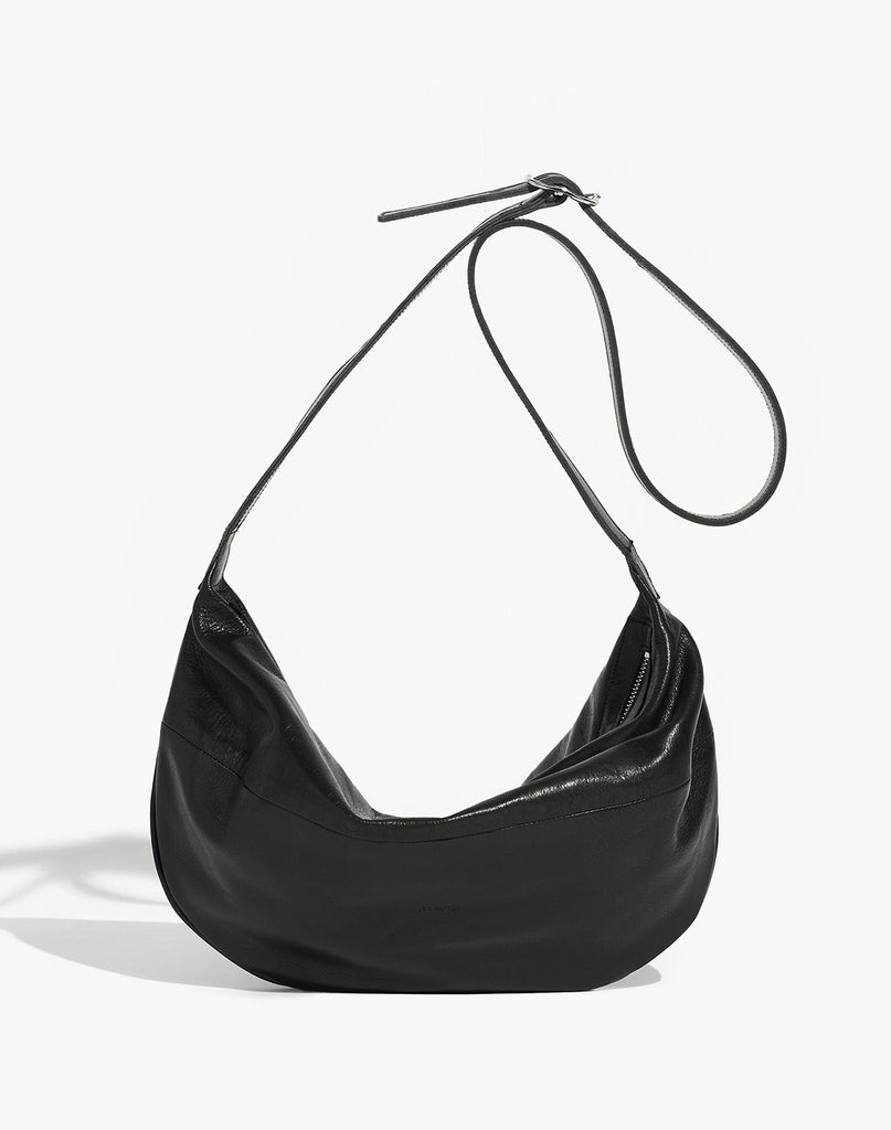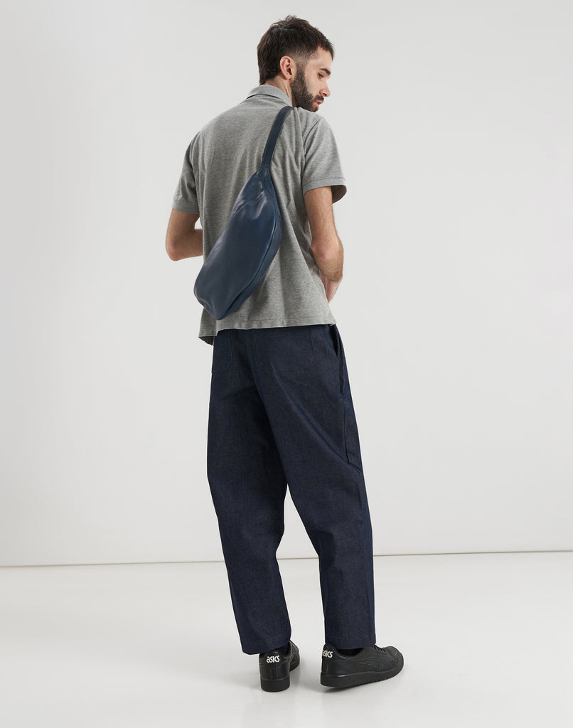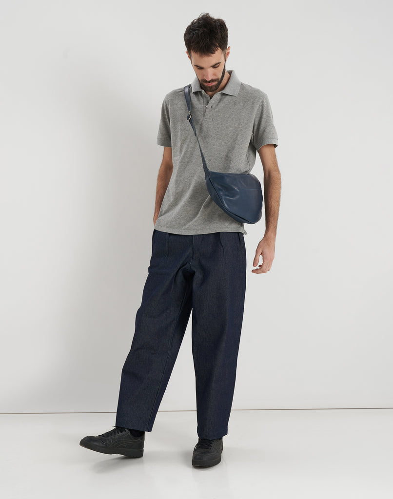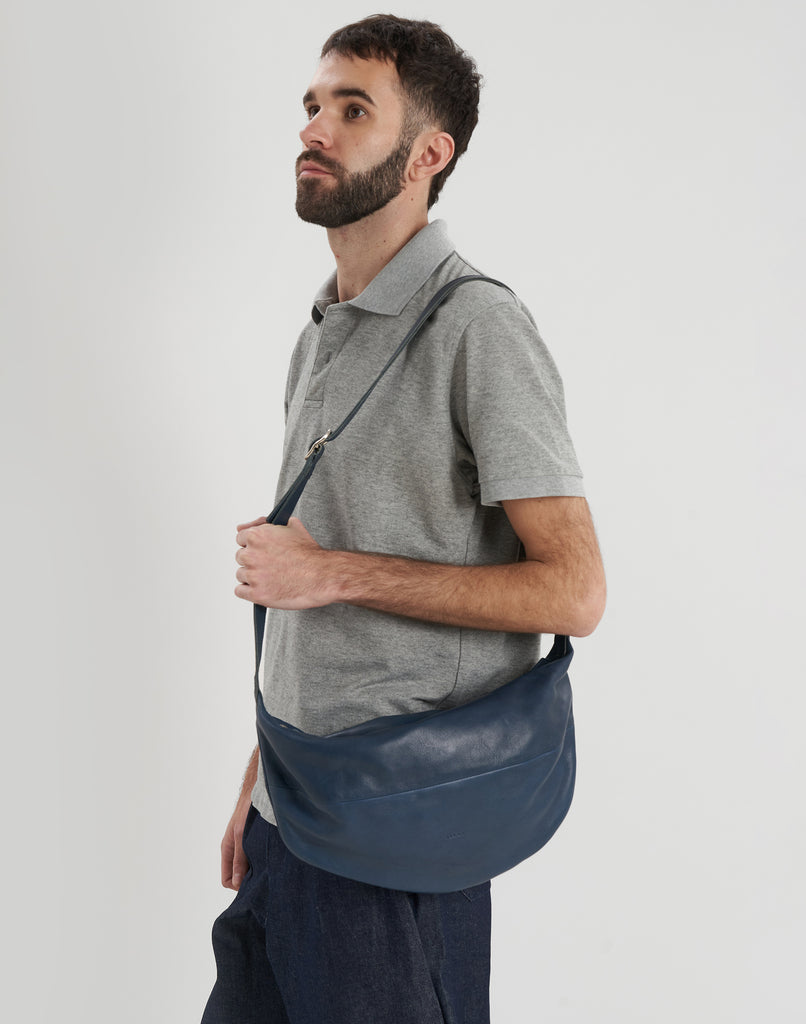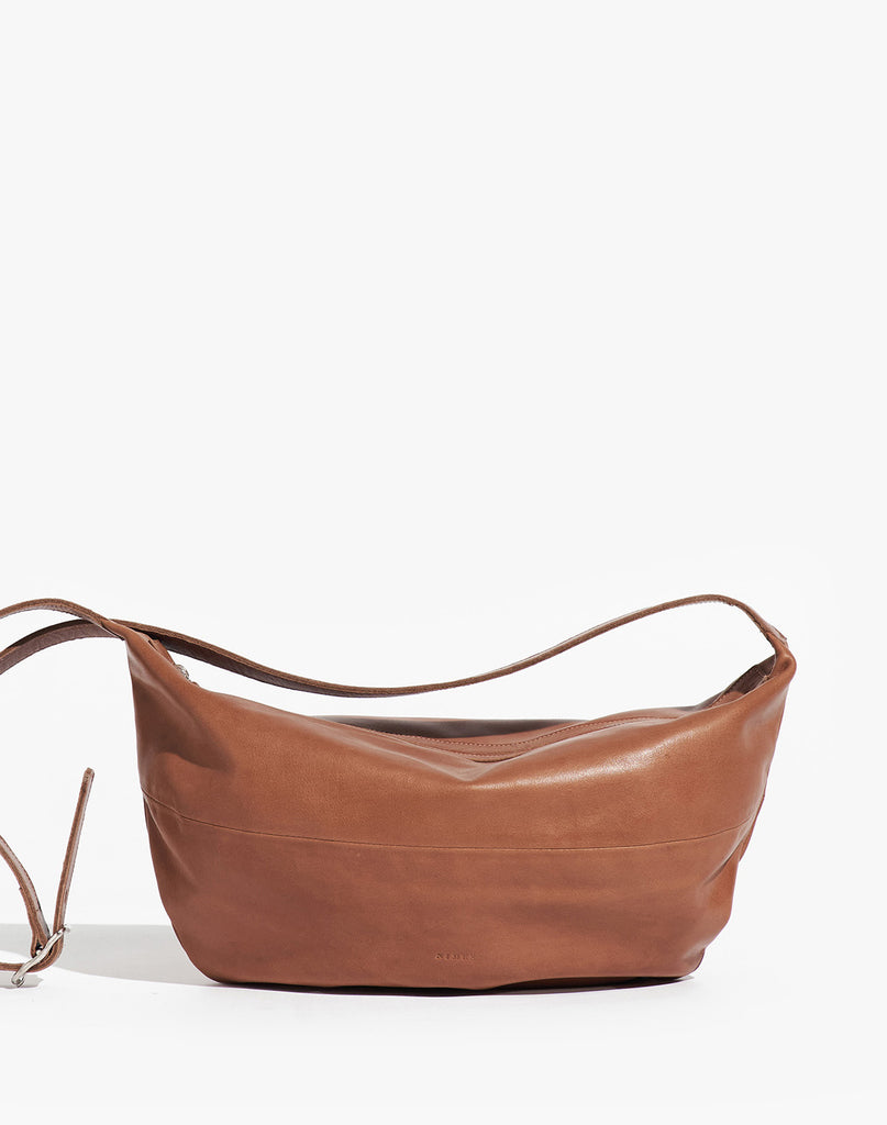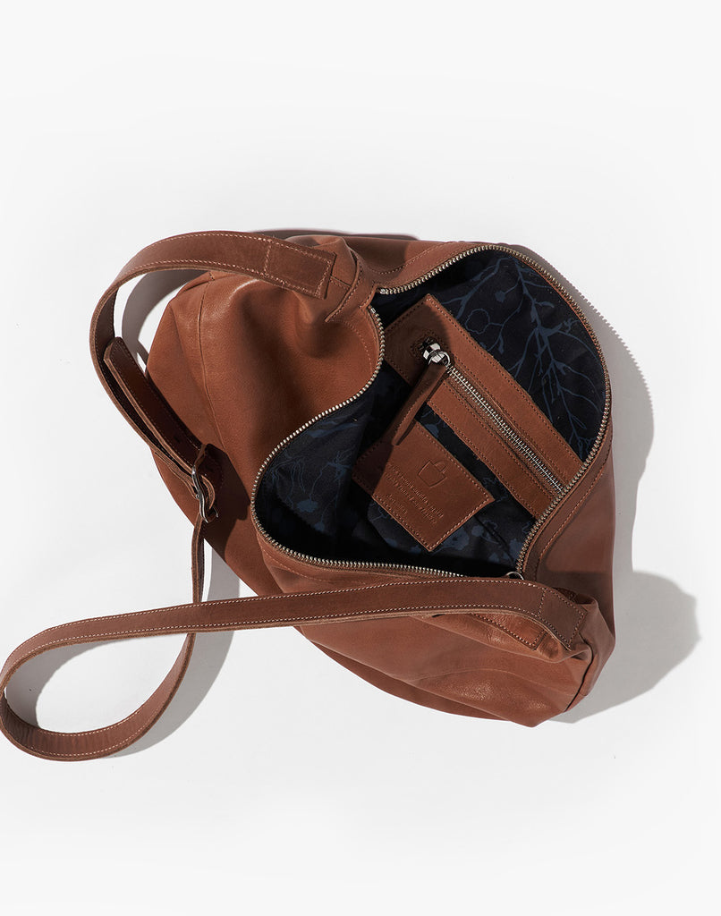 Cartera tipo bandolera con una correa regulable con hebilla que permite llevarla colgada al hombro o cruzada. Está confeccionada en cuero graneado fino, curtido vegetal. En su interior está forrada en gabardina de algodón estampada y posee un bolsillo con cierre.