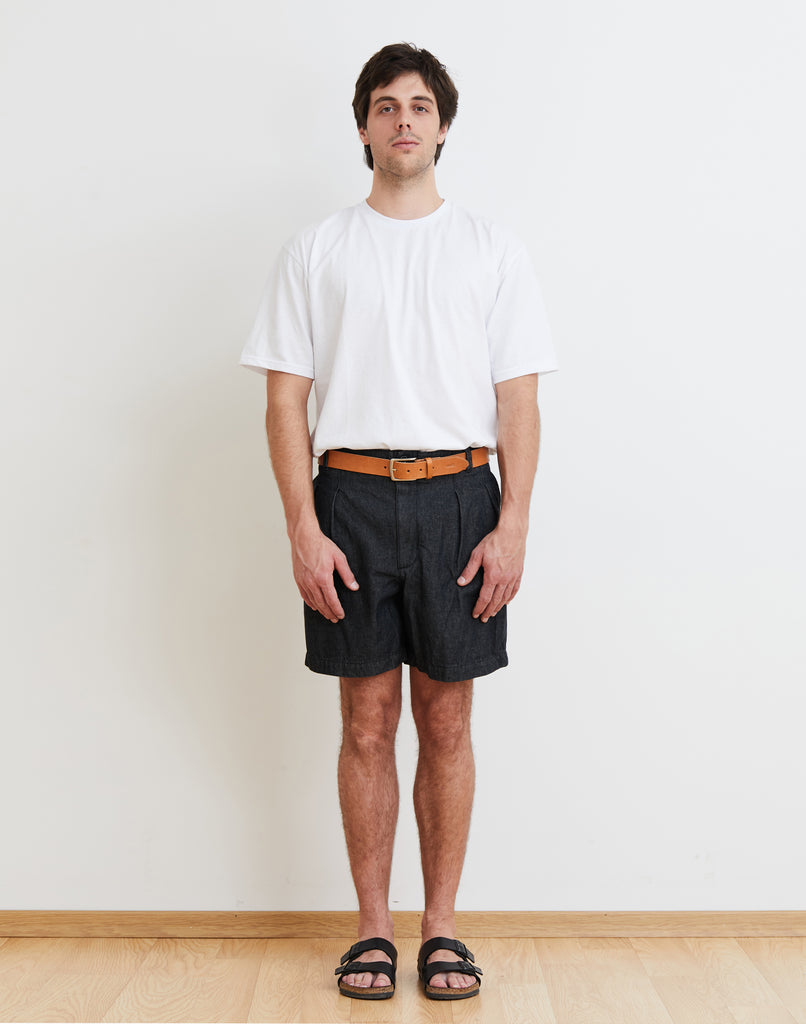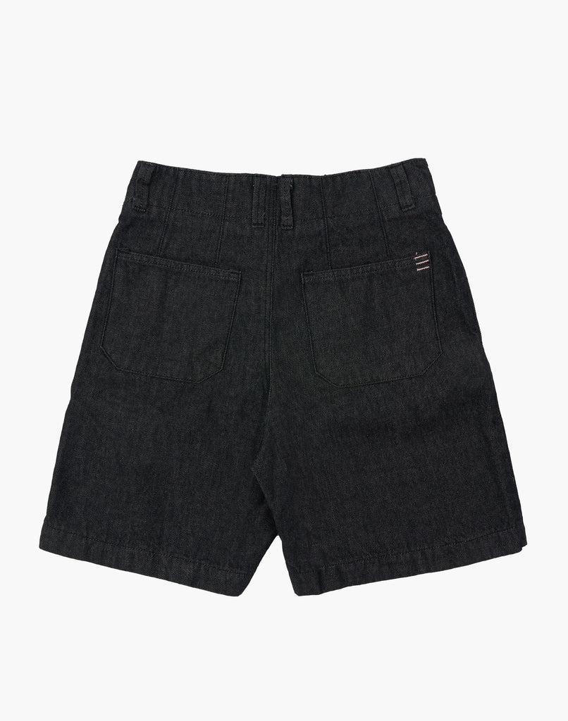 Bermuda unisex de tiro medio y corte recto con pinzas delanteras. Se puede usar tiro alto, medio o bajo según el talle que elijas y el estilo que más te guste. Confeccionado en denim negro 100% algodón.