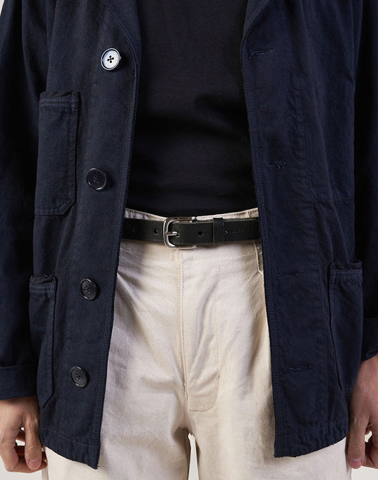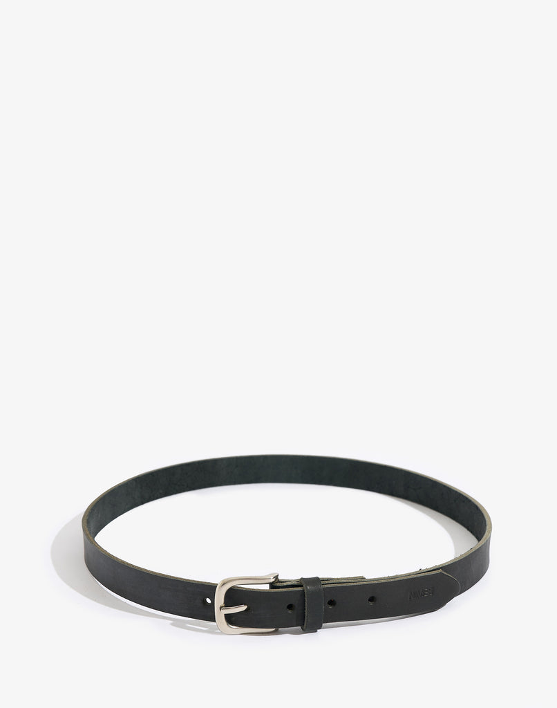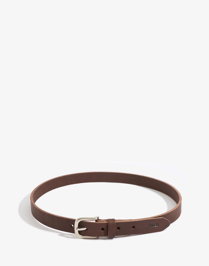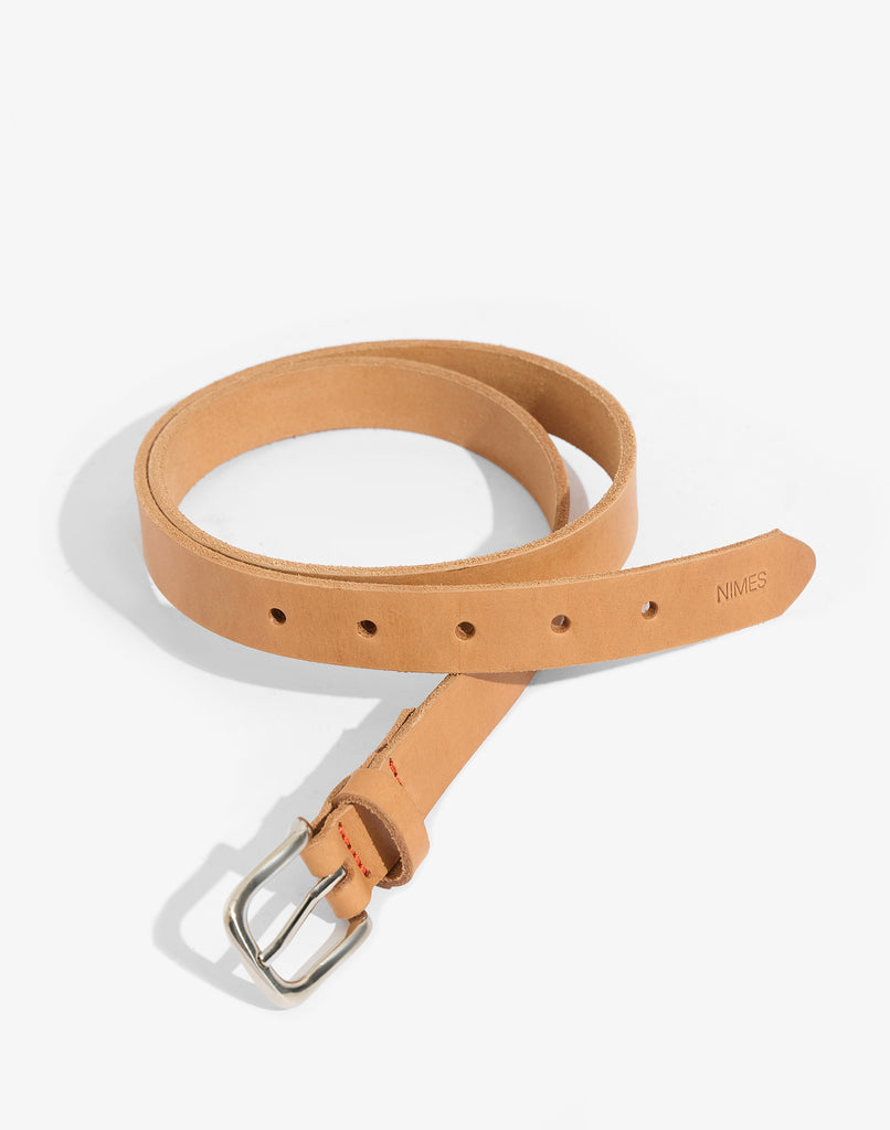 Cinturón fino de cuero liso curtido vegetal con hebilla. Cuenta con el logo grabado en el extremo.