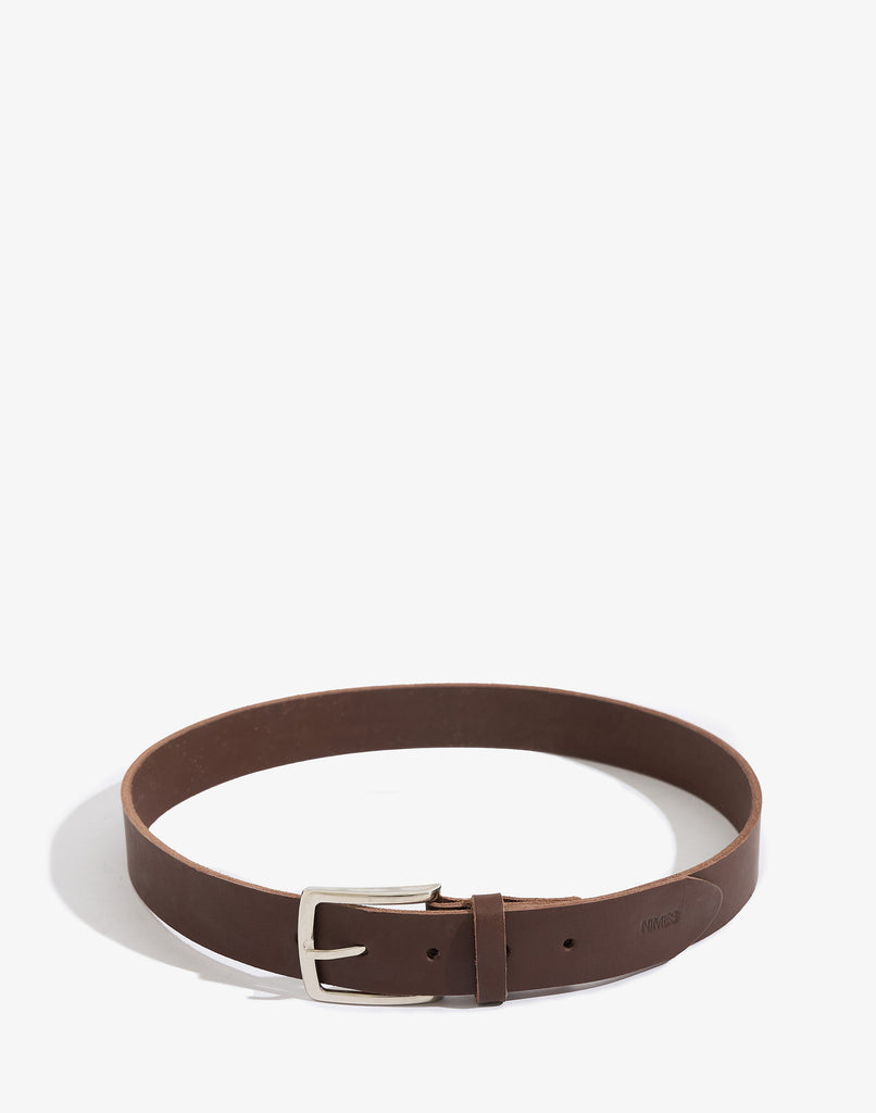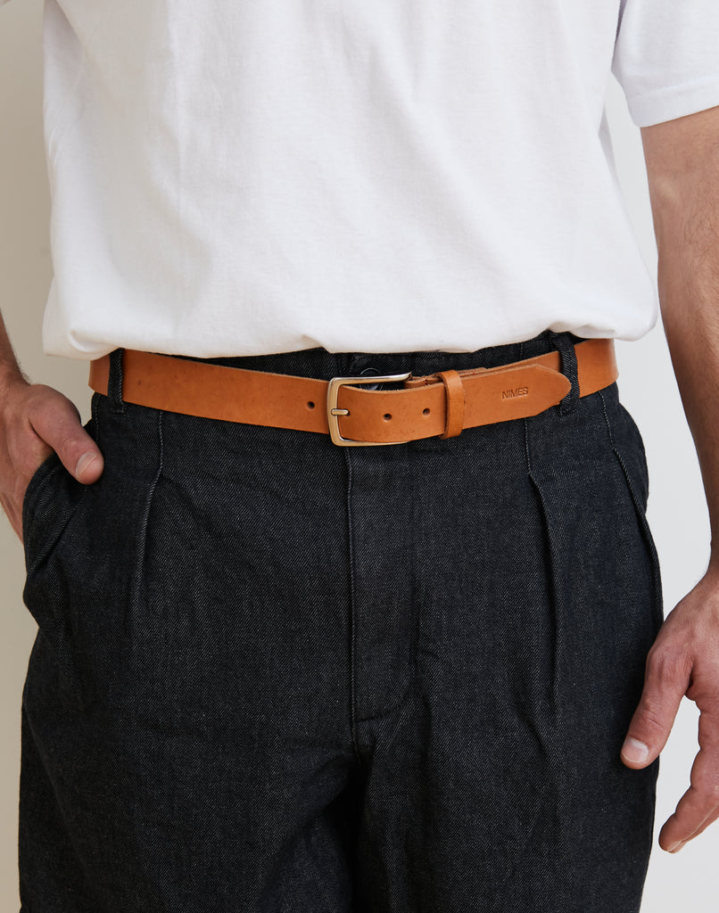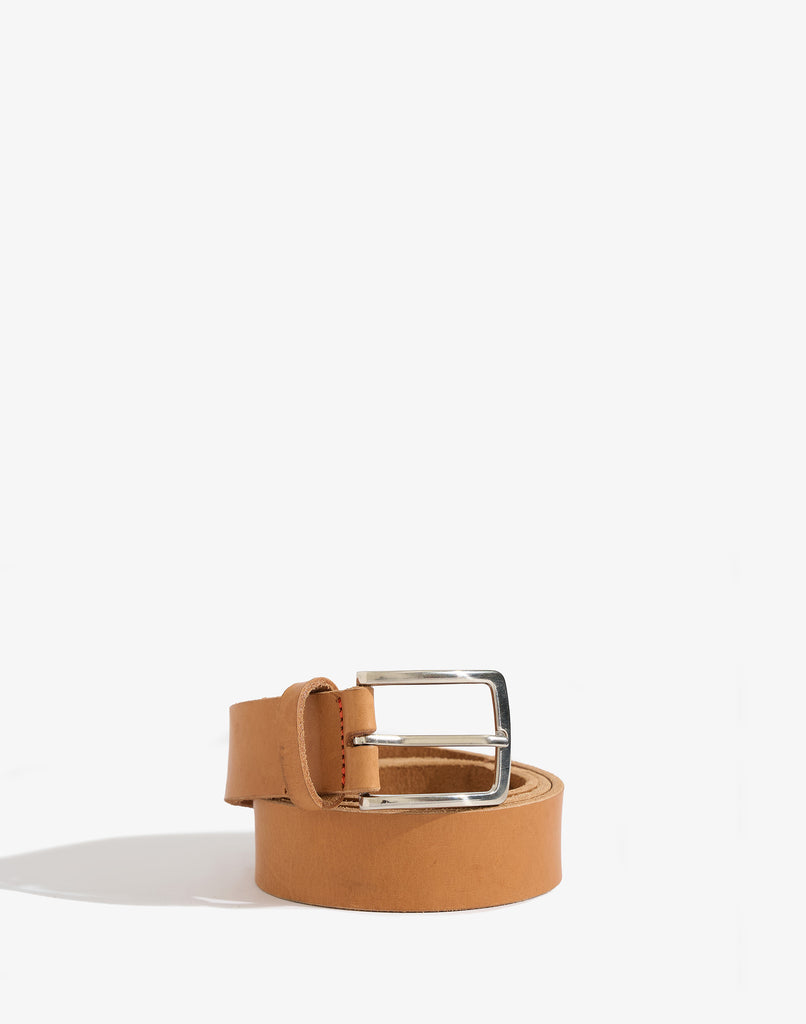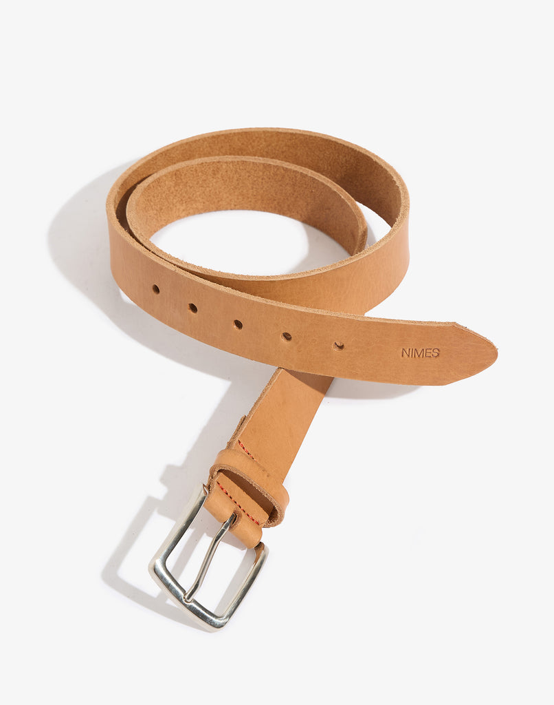 Cinturón ancho de cuero liso curtido vegetal, con hebilla metálica. Cuenta con el logo grabado en el extremo.