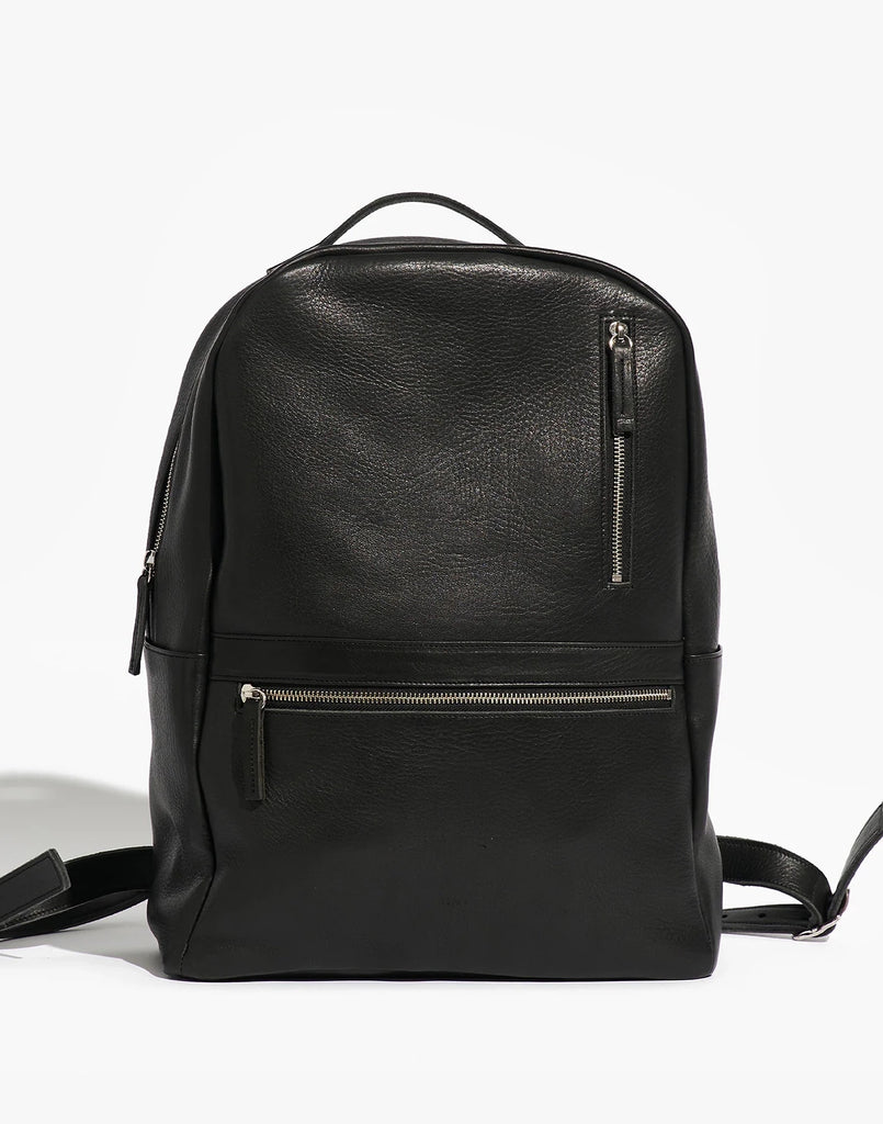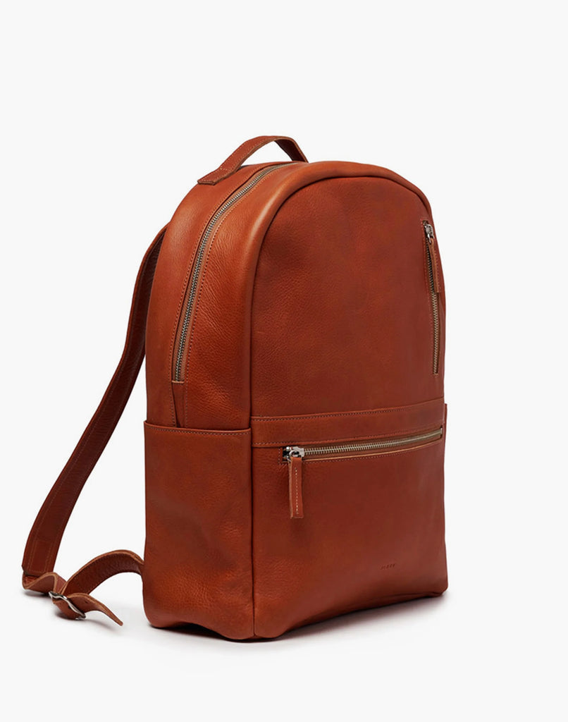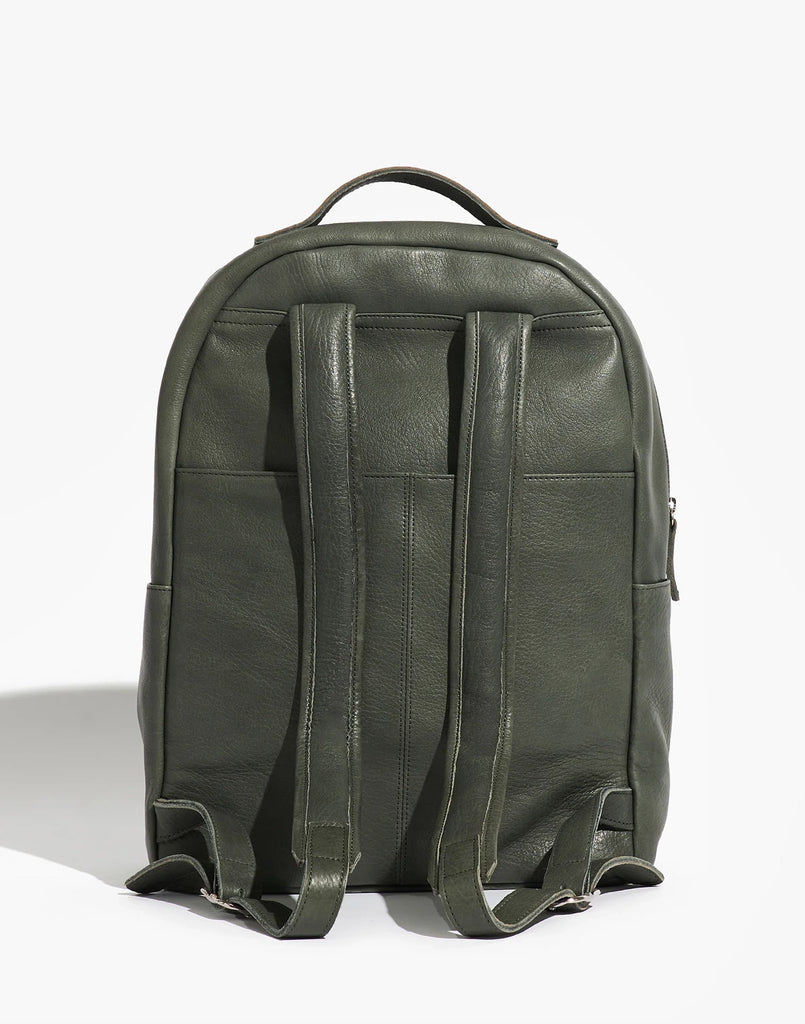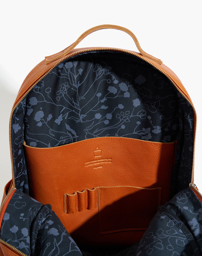 Mochila confeccionada en cuero graneado curtido vegetal ideal para llevar al trabajo o a la facultad por su gran variedad de compartimentos de guardado. Cuenta con dos manijas reforzadas ajustables con hebilla, dos bolsillos externos con cierre en el frente, dos bolsillos laterales y un compartimento trasero. En su interior está forrada con gabardina de algodón estampada y posee un bolsillo de cuero donde cabe una laptop de 14”, con tarjetero y porta lapices. Su espalda es acolchada para mayor protección.