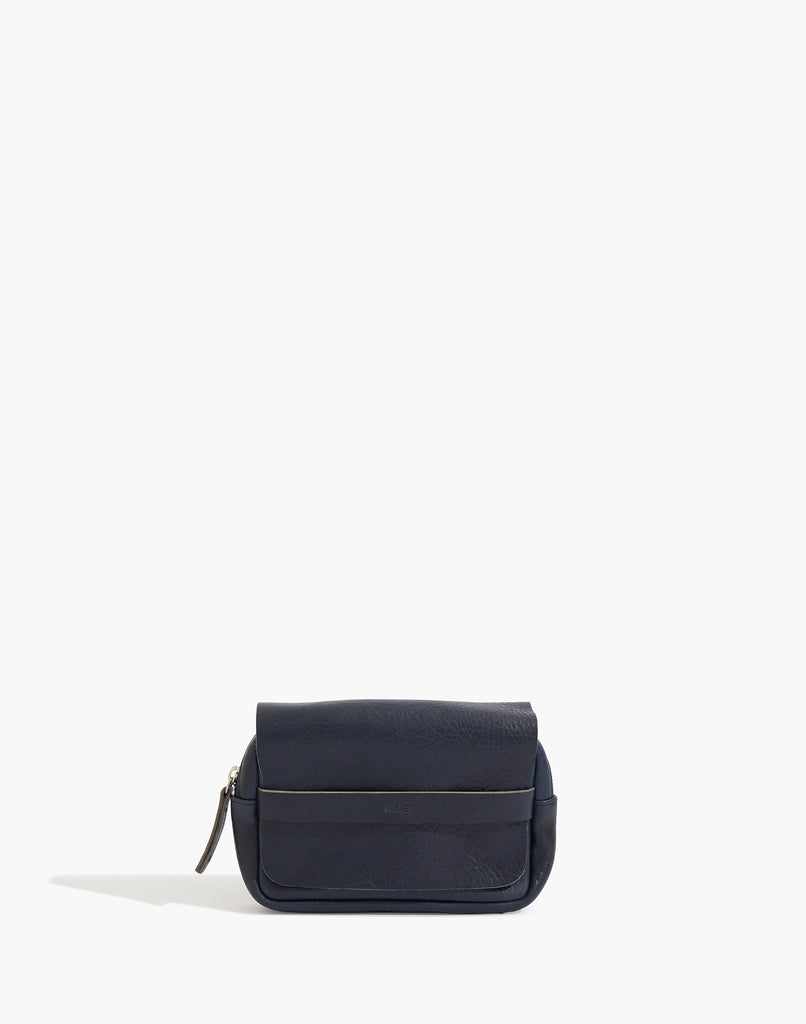 Necessaire confeccionado en cuero graneado curtido vegetal, ideal para llevar en la cartera, usar como bolso de mano o llevar de viaje. En su interior está forrado con gabardina de algodón estampada y posee con un pequeño bolsillo de cuero. Se accede mediante cierre metálico, y cuenta con una tapa tipo solapa con tira de cuero para cerrar.