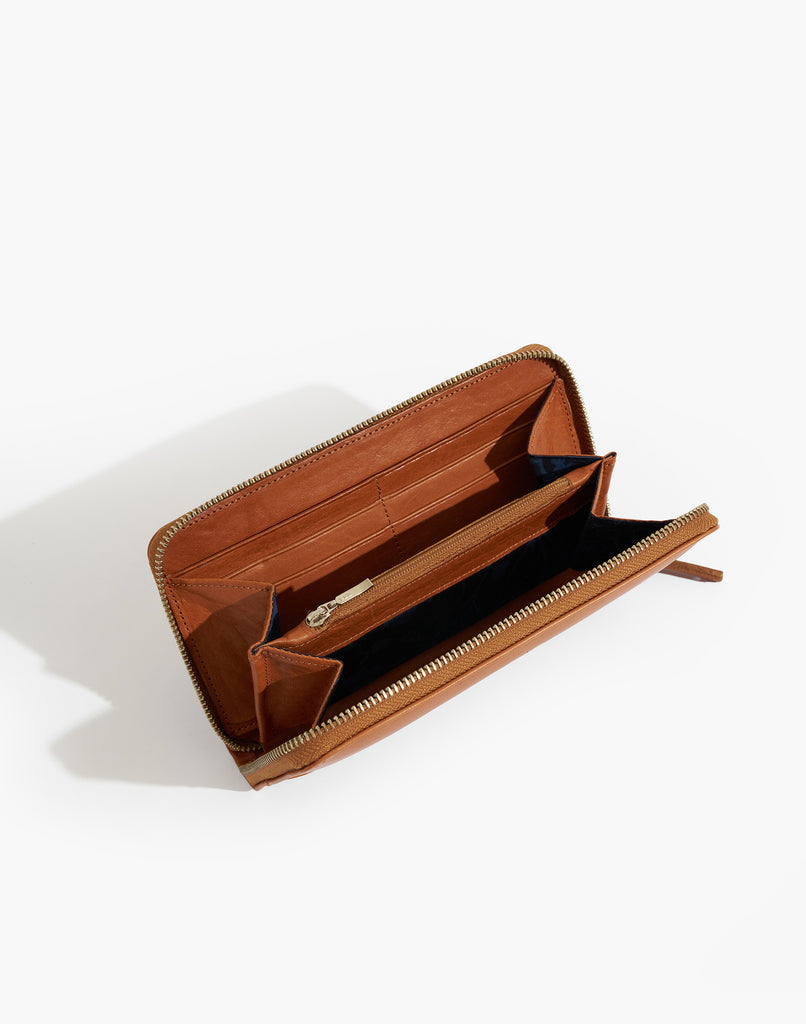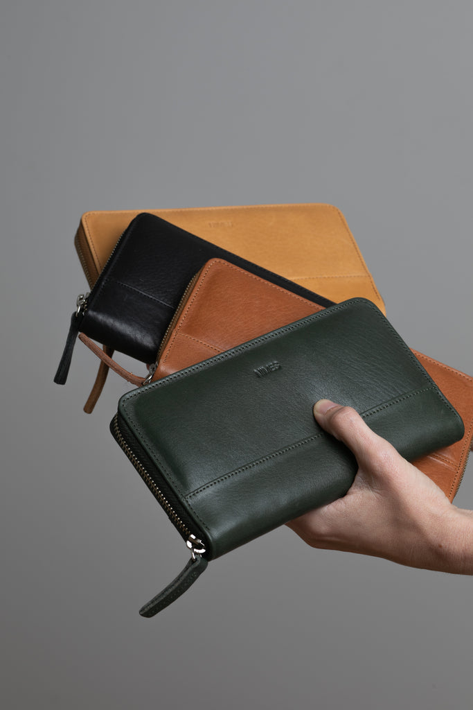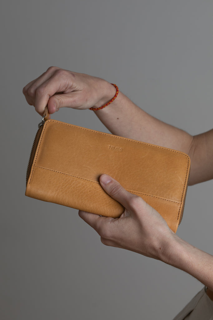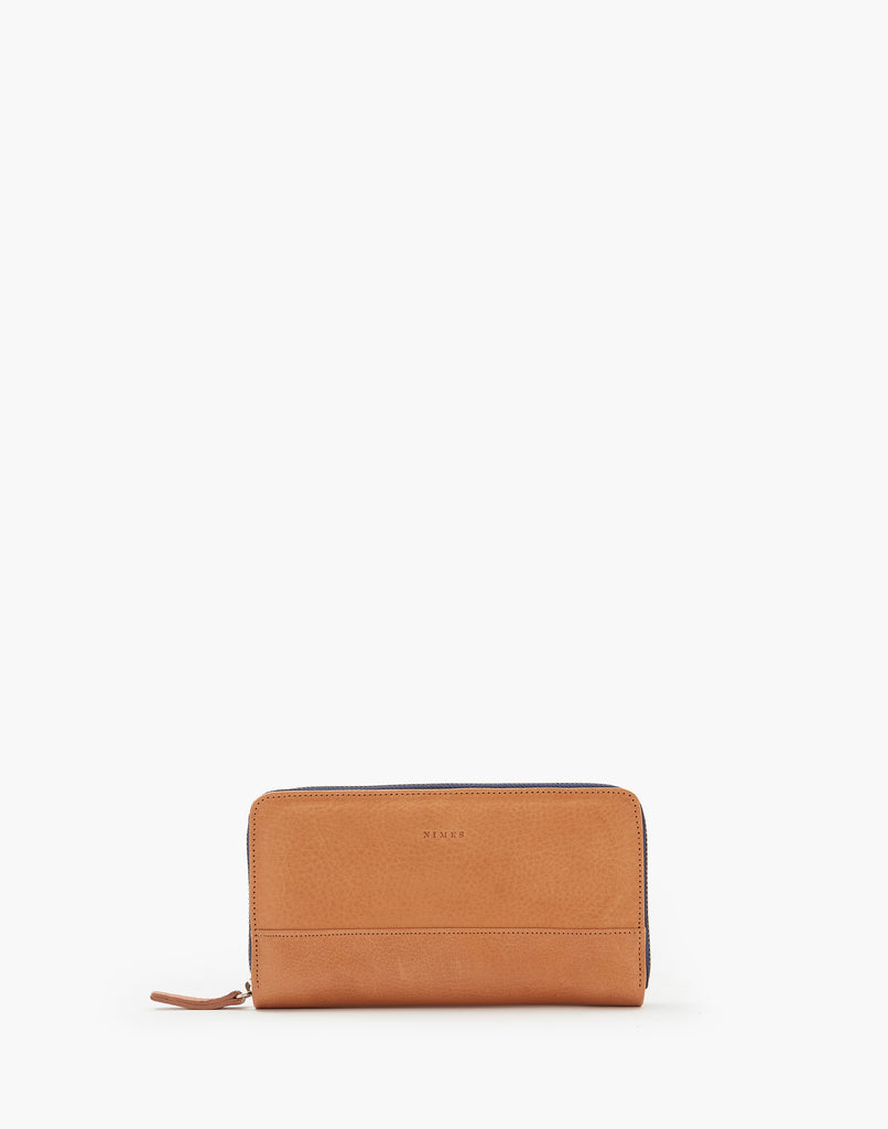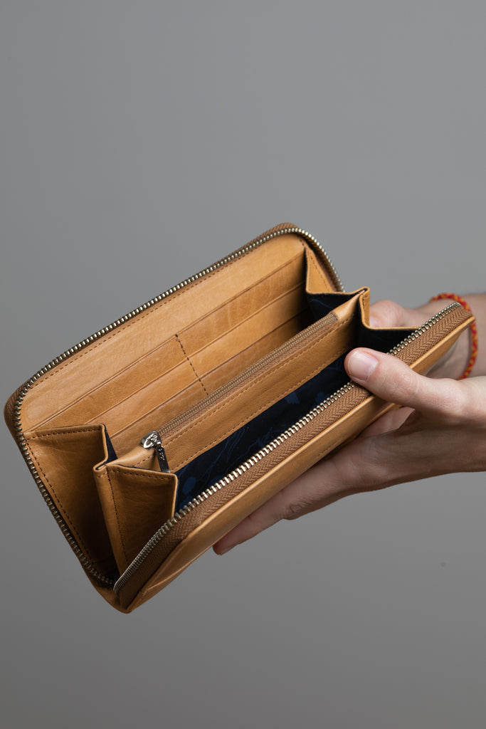 Billetera rectangular con capacidad para 8 tarjetas, dos compartimentos para billetes  y un bolsillo central divisor con cierre. Está confeccionada en cuero graneado curtido vegetal y en su interior está forrada con poplin de algodón estampado.