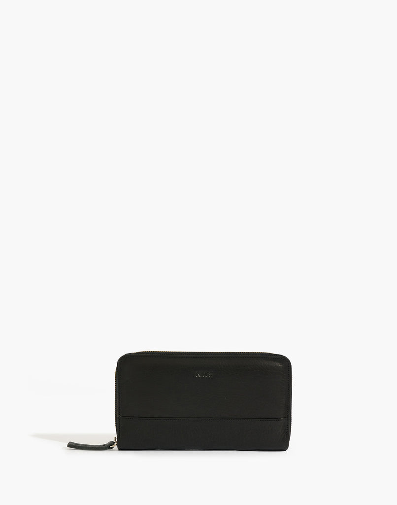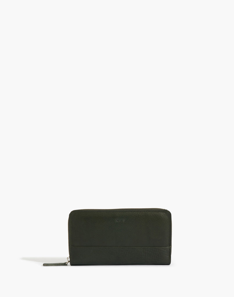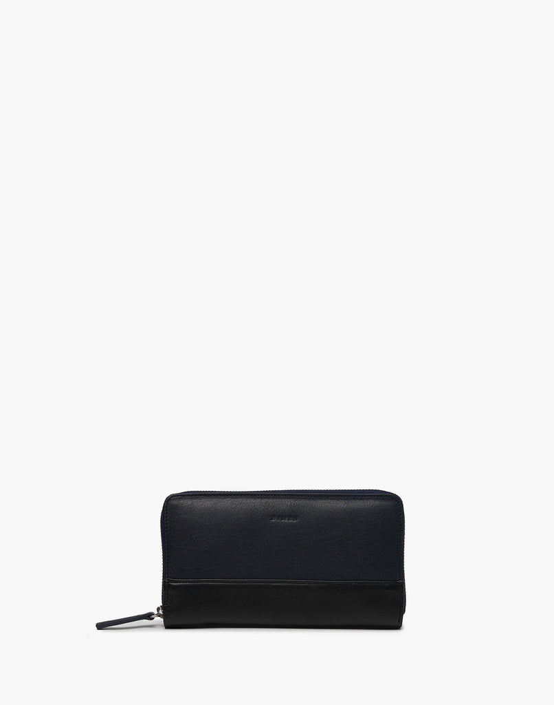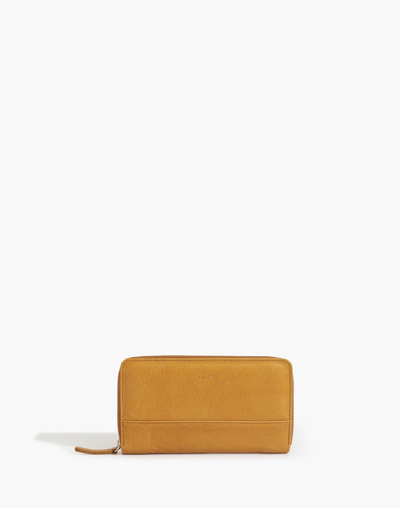 Billetera rectangular con capacidad para 8 tarjetas, dos compartimentos para billetes  y un bolsillo central divisor con cierre. Está confeccionada en cuero graneado curtido vegetal y en su interior está forrada con poplin de algodón estampado.