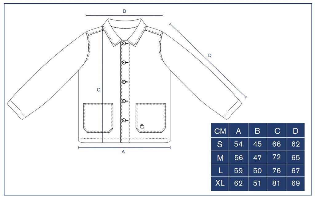 No tiene ningún proceso de lavado ni teñido. Tiene 3 bolsillos plaque externos y un bolsillo interno sin forrar. Viene en talles S-M-L-XL teniendo una gran amplitud de medidas entre talle y talle.