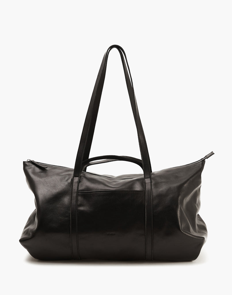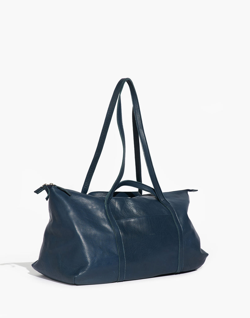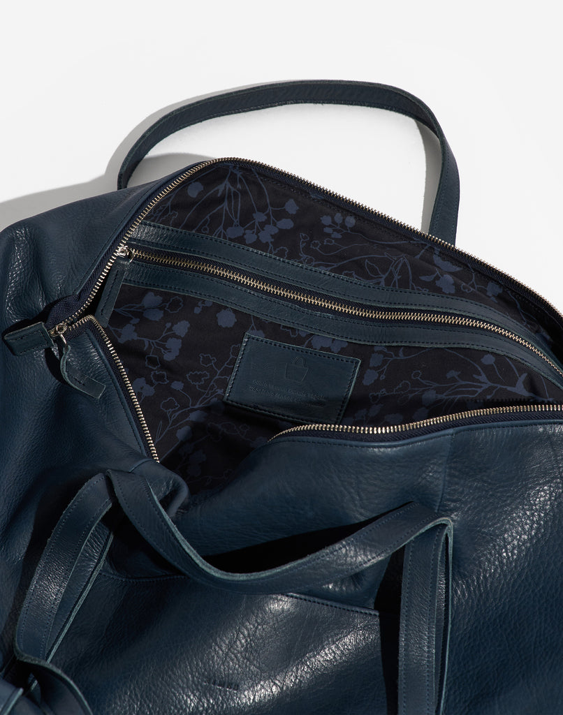 Bolso de viaje con manija de mano y manija larga para llevarlo colgado al hombro. Confeccionado con cuero graneado fino curtido vegetal, presenta un diseño funcional con un bolsillo externo con cierre y otro sin cierre. En su interior está forrado en gabardina de algodón estampada, y cuenta con un bolsillo con cierre.