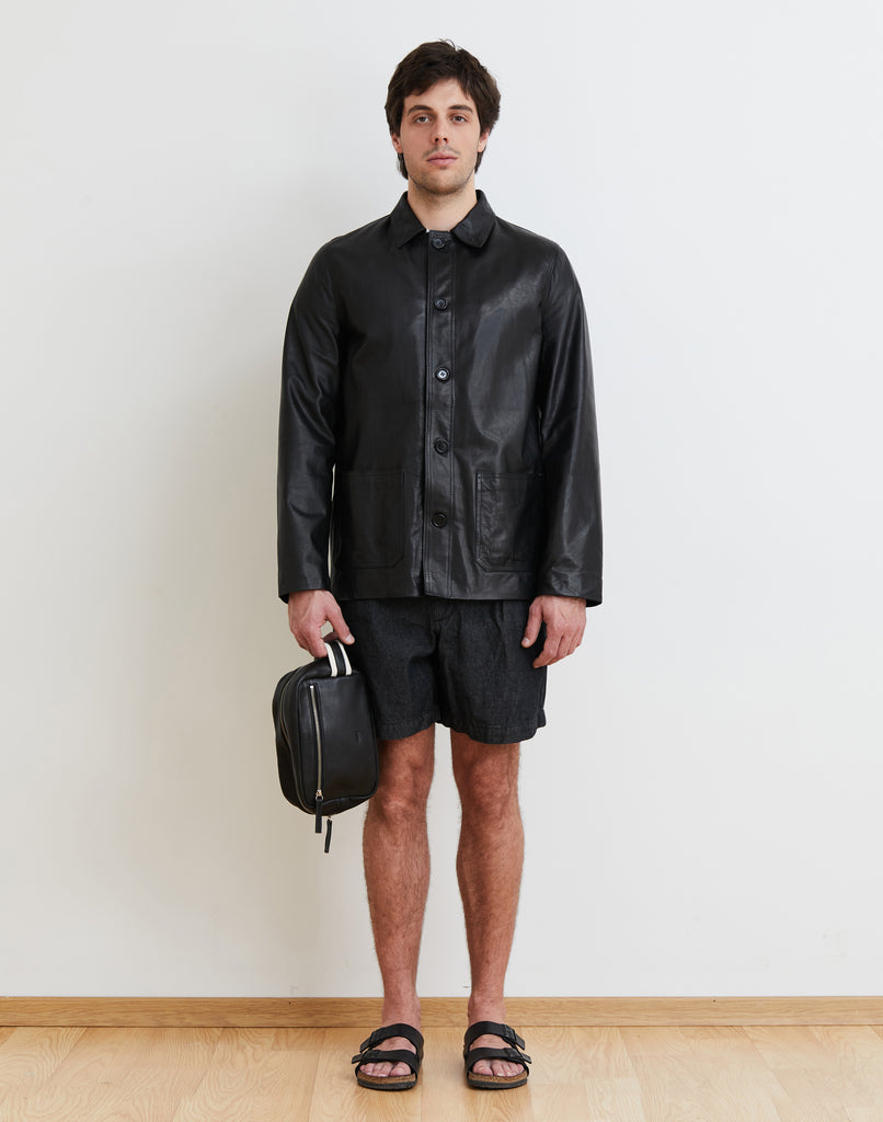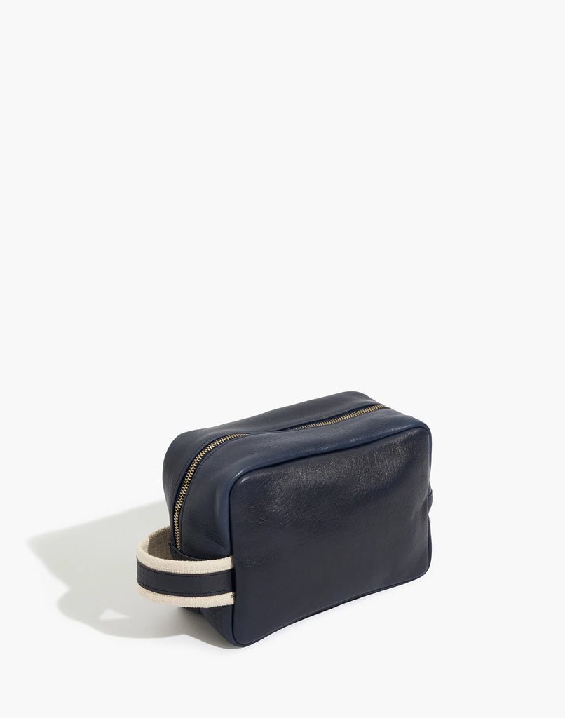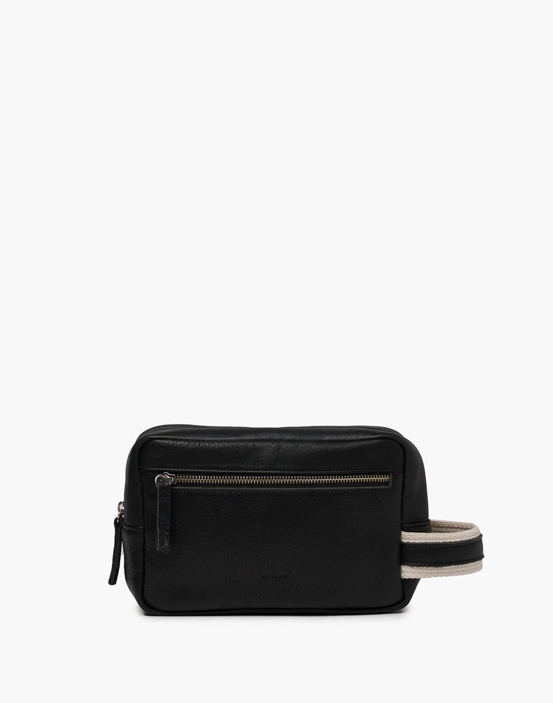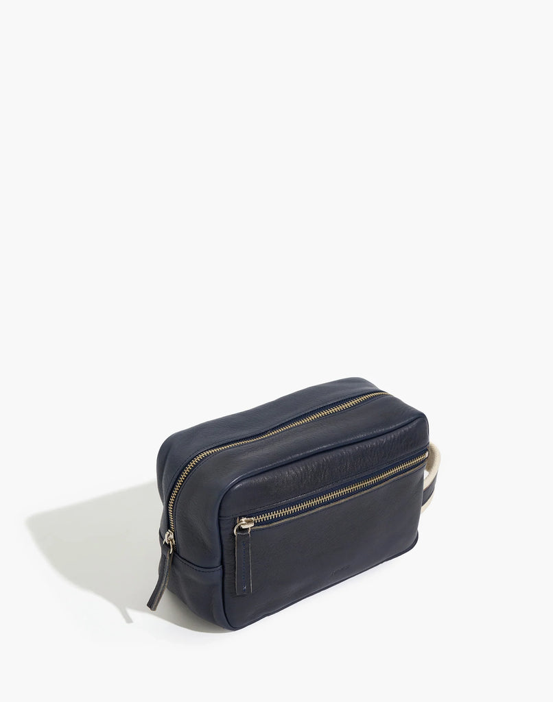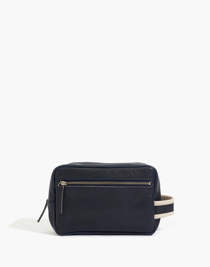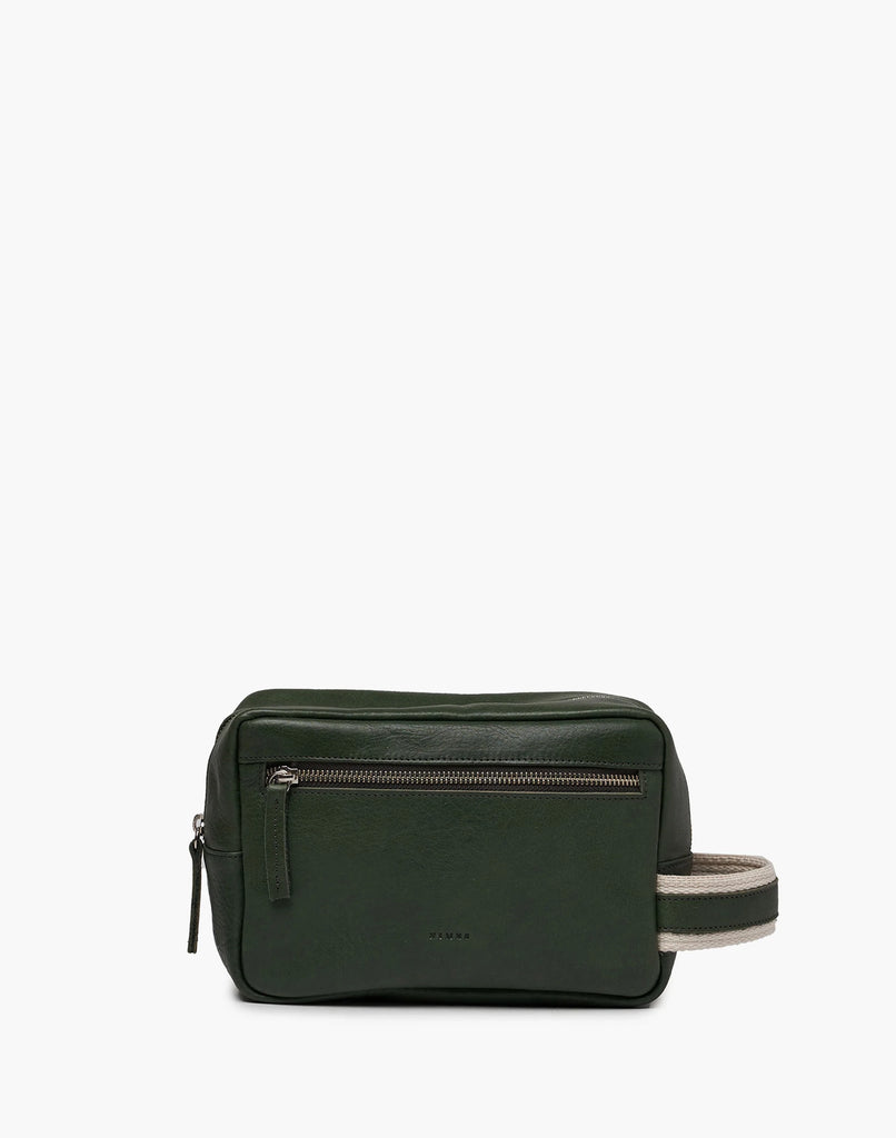 Necessaire ideal para llevar de viaje, confeccionado en cuero graneado curtido vegetal. Posee una manija de mano lateral y un bolsillo externo frontal con cierre. En su interior está forrado con gabardina de algodón estampada y posee un bolsillo pequeño.