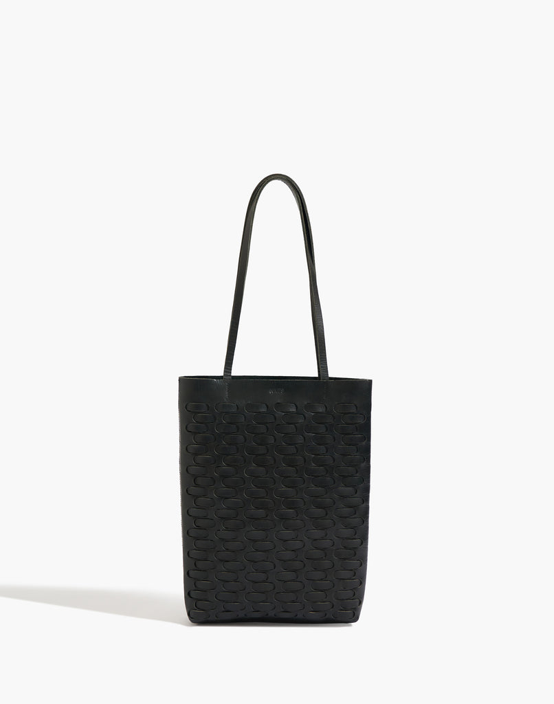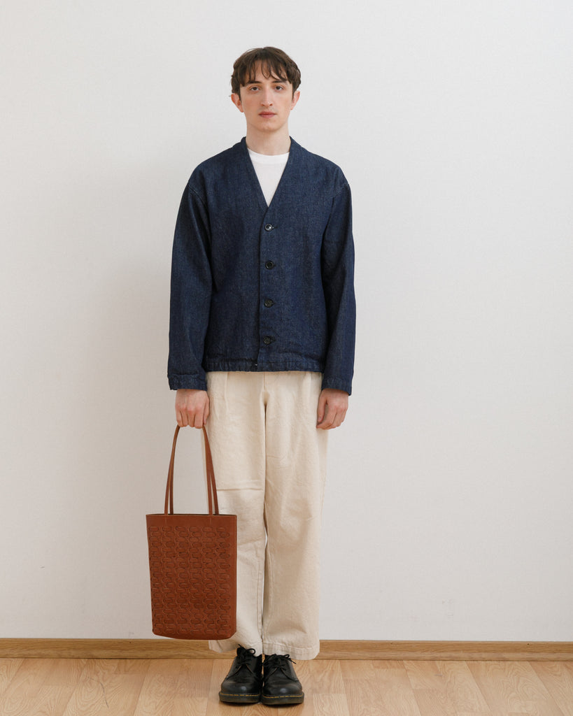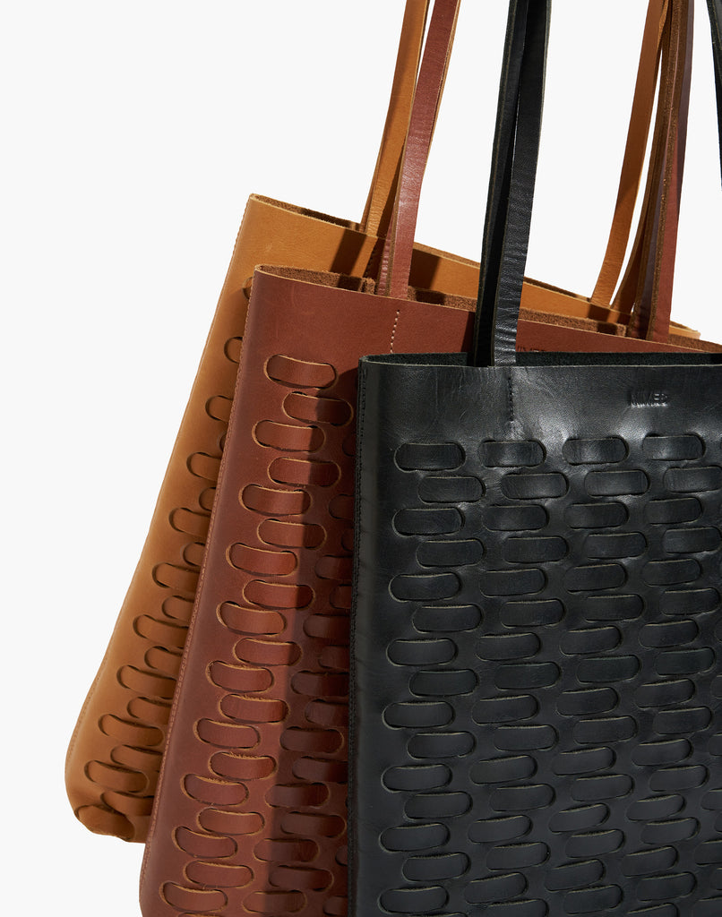 Tote bag diseñada con una trama horizontal, ideal para el uso diario confeccionada en cuero liso, curtido vegetal. Cuenta con un bolsillo interno. Entra una laptop. En su interior no está forrada.